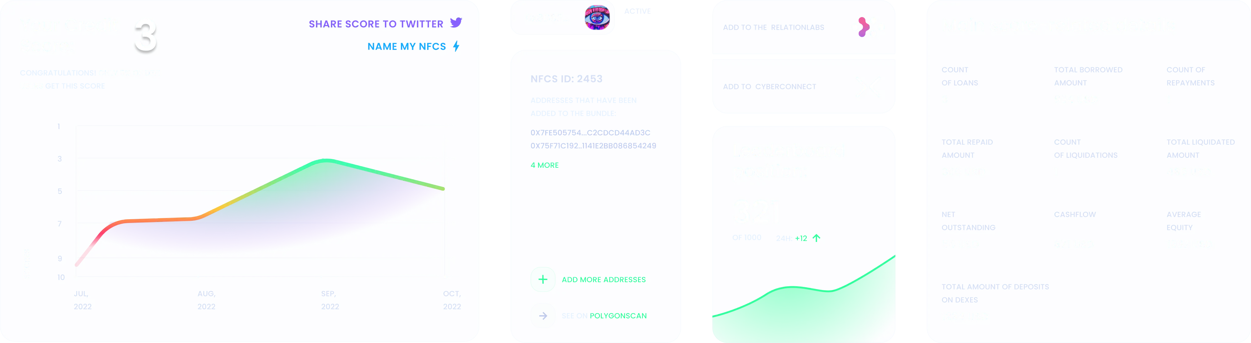 NFCS allows linking more than one address to one credit score. This provides better user experience of accessing RociFi via a single account as well as a chance to improve credit score if a user's DeFi transactional activity is spread across several accounts. Users can connect up to 32 addresses in one bundle. In order to connect several addresses to the NFCS bundle,